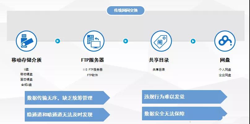 目前市面上也存在很多传统的数据交换方式,比如U盘、移动硬盘,FTP服务器、网闸或网盘,根据金融行业的使用情况,我们重点说下移动存储介质U盘,它虽然满足了隔离的要求,但是用户在使用过程中容易携带病毒,而且难以管理,很容易造成病毒内外网交叉感染甚至中勒索病毒。