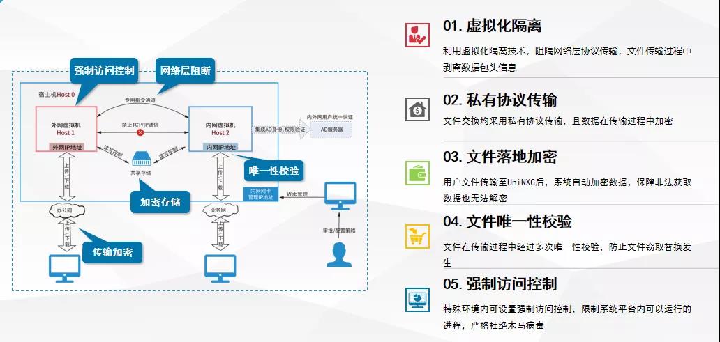 上述传统的方式很难达到文件多网间安全高效传输的需求,针对目前市场上的需求,联软UniNXG安全数据交换系统在网络安全时代重新定义了“文件服务器”的功能标准,业界首创集“网络隔离、审计、审批、防病毒、防泄密、多网合一”于一体的产品。它以网络隔离为基础,以虚拟化技术为核心的解决方案,可在网络隔离的前提下,通过一套系统实现多个隔离网间的文件上传/下载/分享等操作。包括:
