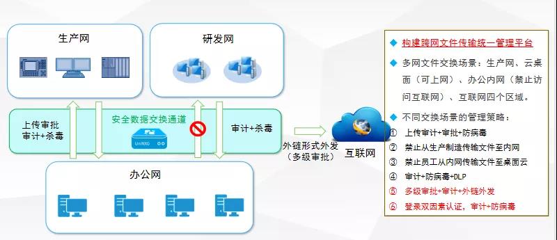 实现不同网络间的单向或双向数据文件交换,如:办公网->业务网、业务。