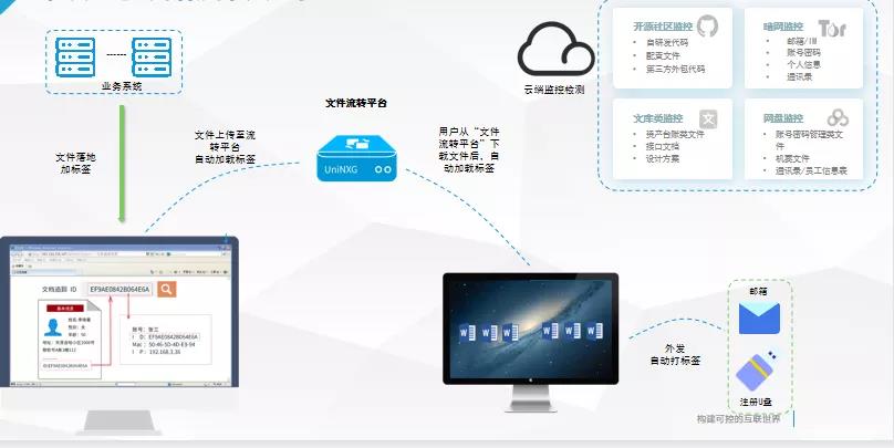 当敏感文件泄密后如何定位到泄密者?提供一种泄密后的文档、图片追溯行为对客户显得尤为重要。联软UniNXG安全数据交换系统支持文档内置标签,结合审计记录,为文档泄露提供了溯源和追踪功能。