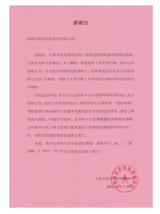 3月24日,联软科技收到来自上海市疾病预防控制中心(以下简称上海疾控中心)发来的感谢信。