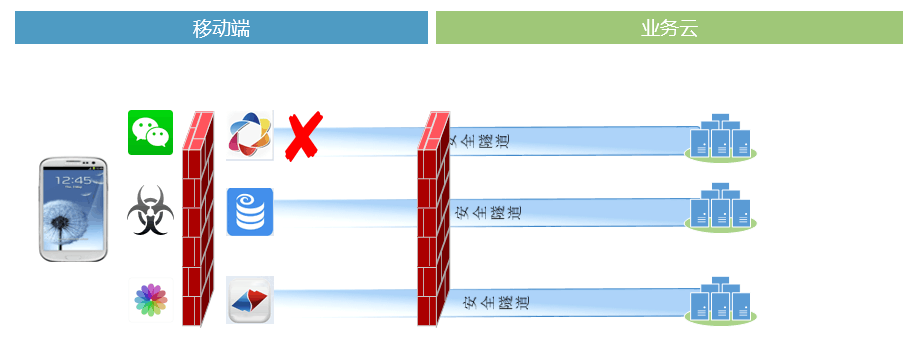 我们独创的应用安全隧道技术,实现了基于应用的安全加密隧道,手机上的个人应用是无法通过安全隧道访问公司内部系统的,同时细化了安全访问控制的颗粒度,可以基于应用、用户、设备关闭安全隧道。