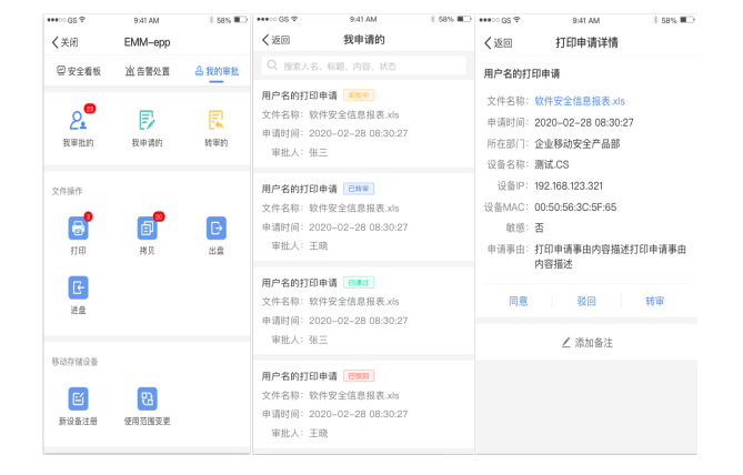 针对PC端审批流程的相关痛点,联软提供了企业移动办公安全支撑平台UniEMM,创新性的将UniDLP上的审批操作开发成一个独立的审批应用,提供移动审批功能,既保证了相关的审批流程安全性,又解放了审批人,只需要通过个人手机无需回到内网使用办公PC即可完成相关审批操作。大大提升了审批人的操作体验,从而提高了审批流程的时效性。