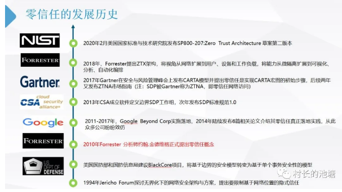 但梳理零信任的发展历史和主要流派可以看出,尽管最早提出Zero Trust一词的是Forrester分析师约翰.金德维格,但零信任并不是凭空才出现的,很早就有了雏形,包括美国国防部的黑核项目,就是希望解决传统默认、静态的网络信任隐藏着巨大风险的问题。
