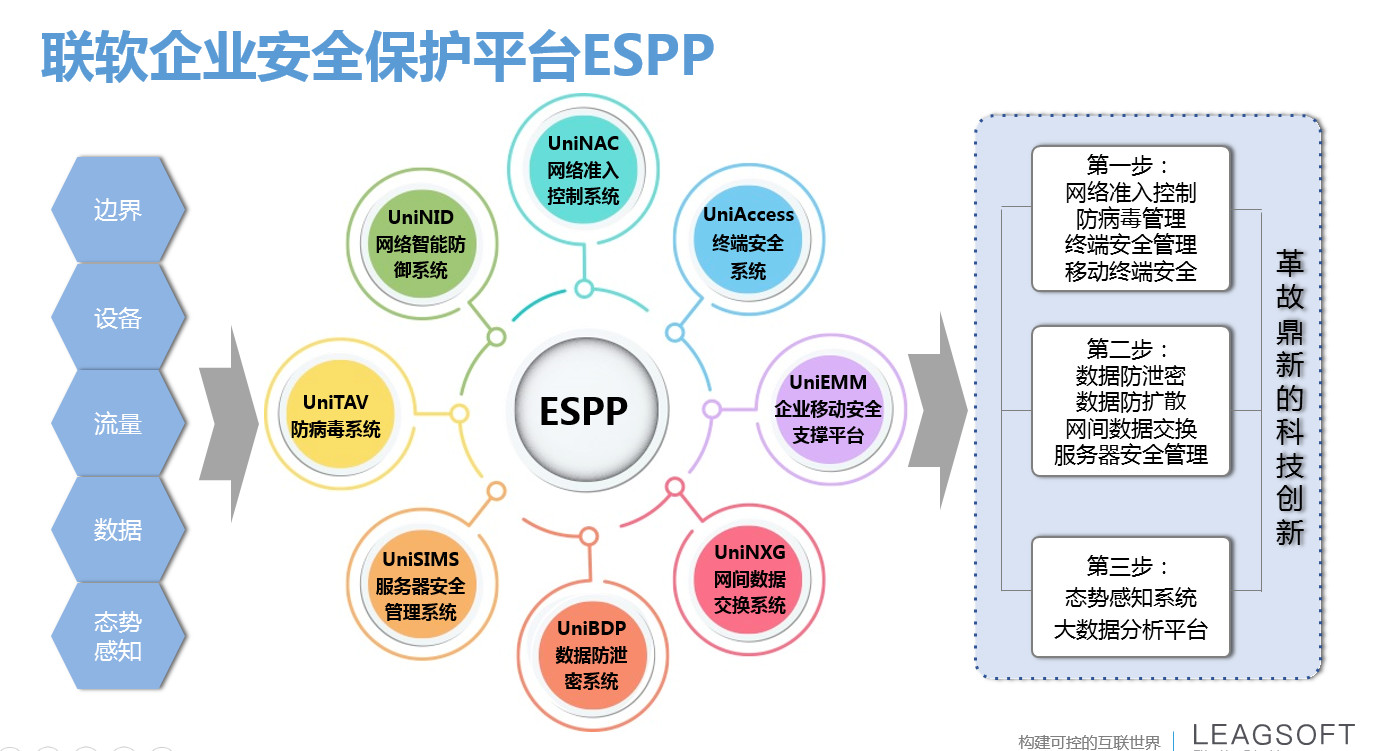 联软科技的产品研发之路,一直专注于网络安全领域,从最初的网络准入和终端安全,直到后来的系统级创新型网络与信息安全管理。在公司发展的历程中,一直专注于对客户和市场的需求不断分析和跟踪。他说:“我们发现客户需要的‘安全’,可以分为‘运营安全’和‘保密安全’两个层面。过去,企业更多的是从关注业务连续性、可用性的角度保障运营安全;现在随着网络安全形势的变化,我们也要关注客户对机密数据的安全保障的需求。”