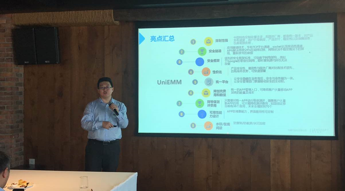 最后,联软科技高级安全顾问明工对联软科技企业移动安全支撑平台在证券行业的应用场景进行了介绍。通过国信证券的案例,向大家展示了企业移动安全支撑平台的优点。用户对于联软这款产品的功能、性能和可靠性给予了高度肯定,并表示使用此方案大大降低了企业配发设备采购成本。