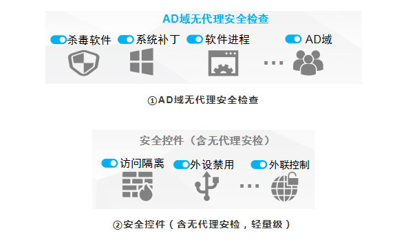 随着企业管控面扩大,准入系统中部署的Agent逐渐增多,尤其是有AD域控的企业,面临着推广新Agent的兼容性及阻力大等问题,这一点在制造业和小金融企业中现象较多,针对这种现象,联软新一代网络准入控制系统开发了适应多场景的安全合规检查,企业终端设备无需任何Agent,就可实现电脑终端的安全检查和准入,威胁检测。企业网中的服务器、网络设备、移动终端、哑终端(打印机、摄像头等)等设备可以采用“指纹”认证的准入方式。
