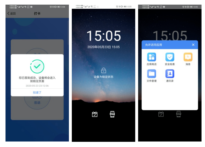 联软独有功能,联软EMM提供上下班打卡和请销假审批功能,对于需要对手机进行强管控的特殊单位,还可以实现上班打卡锁定手机限定使用功能,下班打卡解锁,并可临时请假经过上级审批后解锁。