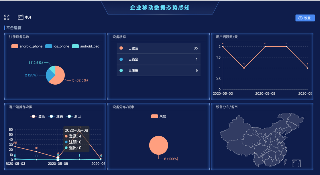 态势感知分为三个板块:业务态势 、运营态势、安全态势;态势报表模块标题、内容、大小均可自定义。