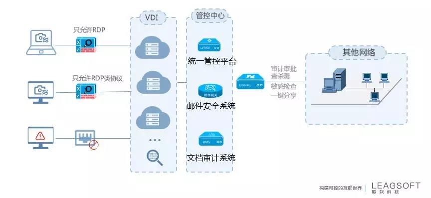 【方案要点】许多金融机构通过云桌面来解决外包人员的泄密问题,仍旧存在泄密风险,所以在设备入网时与交换机联动,只允许合法的设备接入;云桌面内安装客户端启用水印和DLP功能,对云桌面内的信息资产进行分类分级和对拍照进行追溯;针对数据交换需求,我们提供数据安全摆渡系统,禁用本地的外设。