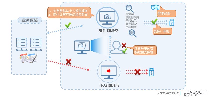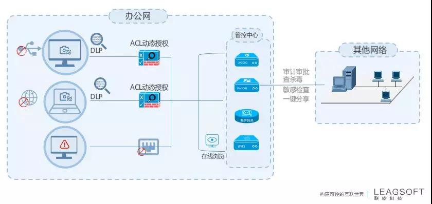 【方案要点】通过网络准入控制的动态授权限定私人设备只能访问互联网,并提供数据安全摆渡系统,作为外部数据导入入口,保障在网络隔离的前提下将外部数据安全的导入到内部终端。