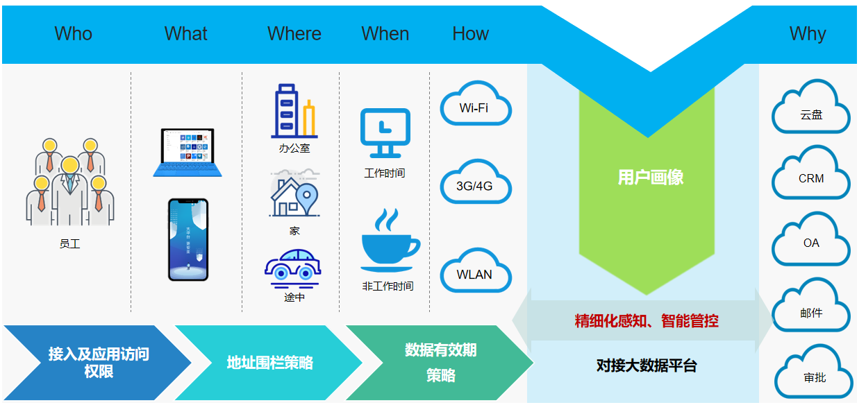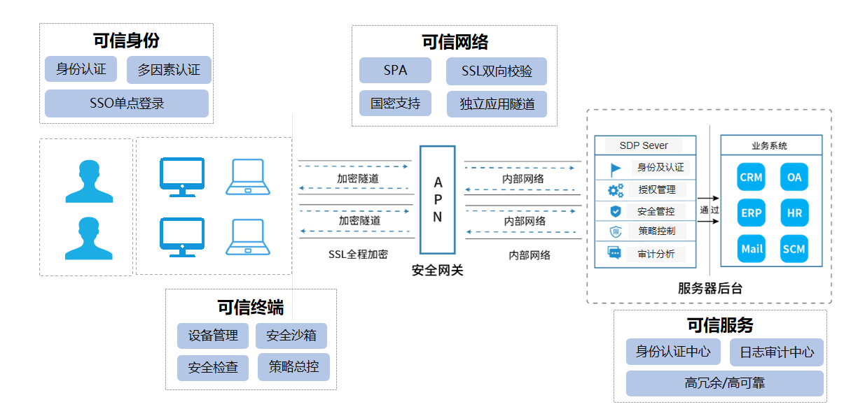权限细粒度最小化,通过身份、设备、环境、应用进行身份验证,基于应用授权,访问所有资源必须要认证、授权、加密。
