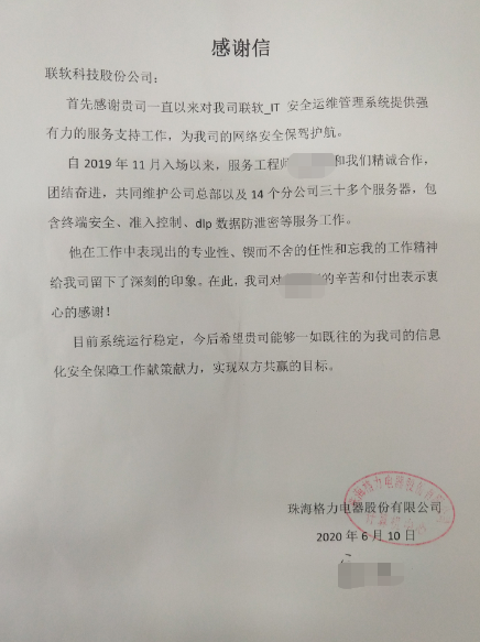 信中对于我司此次所承担的联软IT安全运维管理系统的服务支持工作给予了高度评价。我司服务工程师秉承对工作认真负责的态度,助力格力电器总部以及14个分公司30多个服务器,包括终端安全、准入控制、DLP数据防泄密等安全工作,为格力电器的网络安全保驾护航。