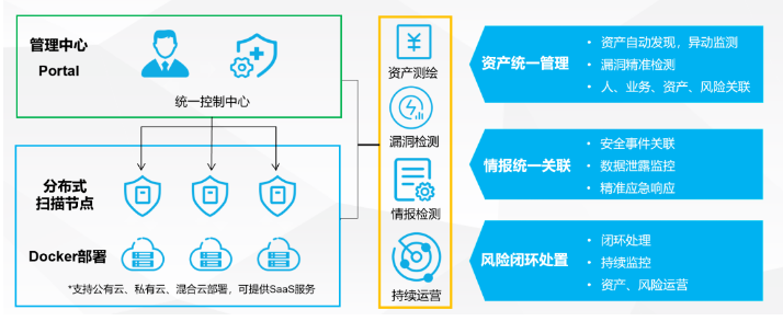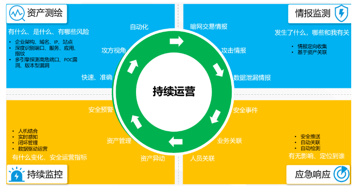 新版本基于以资产为核心的安全运营模型,以资产测绘为起点,结合情报监测、应急响应和持续监控,实现对资产的持续安全运营,解决网络空间有什么、是什么、有什么风险、哪些业务和责任人有关,风险解决的优先级如何等问题,并可实现整体资产和脆弱性态势感知。