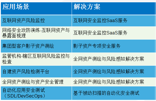产品可应用到更丰富的场景中,既满足单一客户互联网资产风险监控或包含众多分支或下属单位的全网资产测绘要求,也能给行业或地区监管提供资产稽核、互联网资产归属梳理、单一风险快速排查等高度可扩展方案。