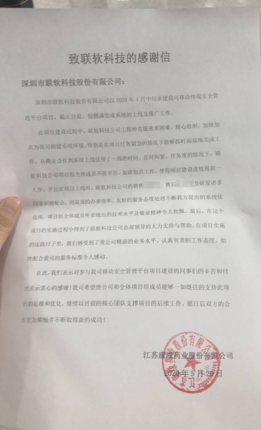 近日,联软科技收到了江苏康缘药业股份有限公司(简称康缘药业)发来的感谢信。