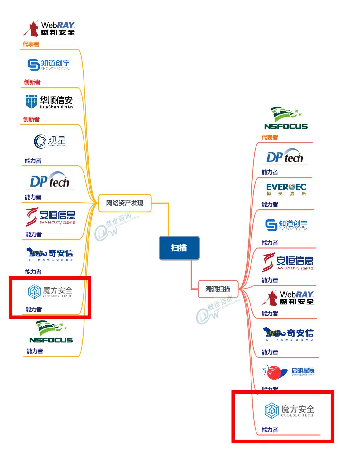 能力图谱将信息基础环境、业务应用场景和网络安全保障划分为八个维度,每个维度又划分成不同的细分领域并一直对应到各领域的优秀安全能力提供者,力求全面、清晰的反映网络安全各细分领域,并突出安全能力者,为国家部门、行业用户、研究机构和资本机构提供参考。魔方安全凭借强劲的技术和市场能力,成为“通用概念”-“扫描”中的网络资产发现和漏洞扫描两大方向的行业能力者。