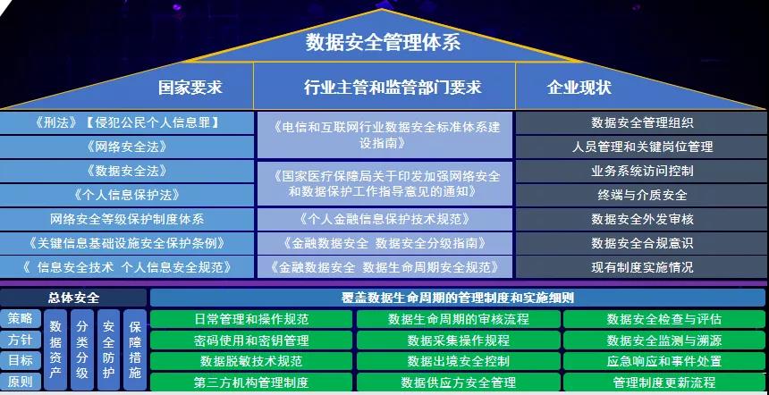 首先是管理体系,主要根据国家要求、行业监管部门要求以及企业的现状去建设,了解企业现状,找出潜在的核心问题和风险。再去制定总体的安全策略,确定组织架构与职责、制定战略目标。最后围绕从数据采集到销毁的数据全生命周期去制定相关管理制度和实施细则。