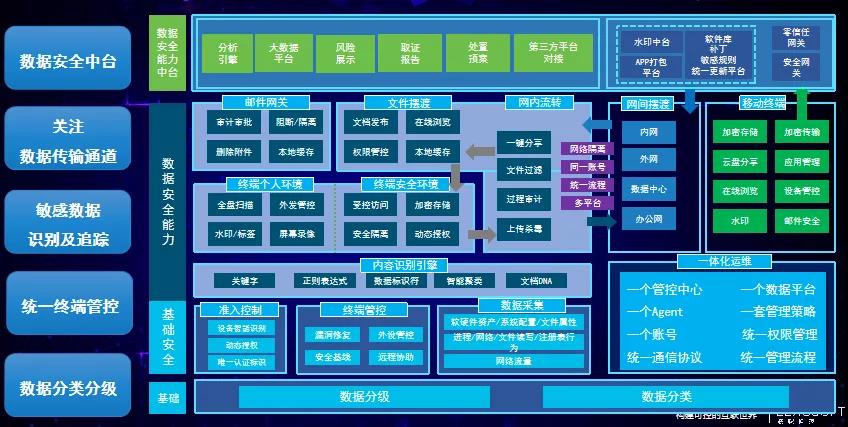 对于企业来讲,常见的数据安全技术手段很多,数据保护方案必须基于复杂多变的业务场景,需要在不同的网络区域和应用场景下采取不同的管控手段。在办公区域主要部署终端DLP、加密、水印等;在网络层部署网络DLP、Web DLP及跨网数据交换平台,针对外部接入就部署基于零信任架构的SDP和EMM产品;服务器区主要就是内容识别、数据库审计和脱敏等。全面灵活的实施部署,使得企业的数据安全技术体系变得更加完善。