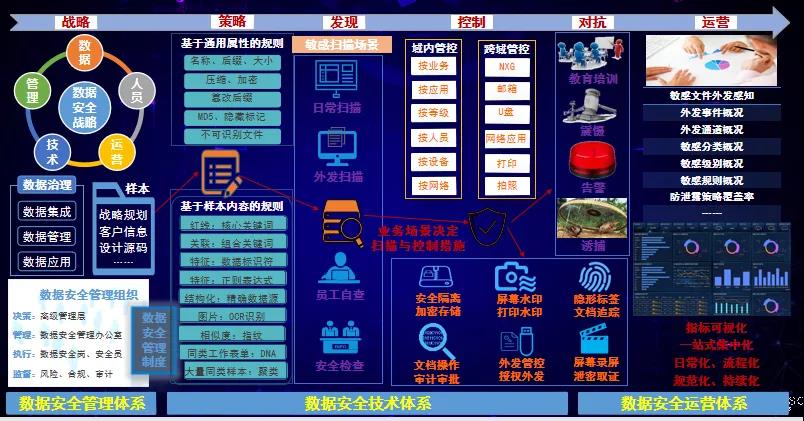 管控的技术手段很多,但如何高效的运行也是需要企业去考虑的,最关键的是数据安全运营的指标,作为运营者,即企业的IT科技部门可以通过大数据分析平台,根据指标结果情况反馈给业务部门,告知业务部门数据安全管理的能力达到的水平程度,是否达标,还存在哪些风险问题,解决这些问题的过程就需要通过培训、核查、自查等去持续不断的完善和优化,从而保障数据的“长治久安”。