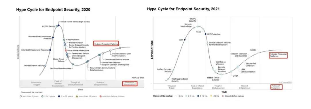 Gartner连续两年都将Endpoint Protection Platforms(EPP)纳入半岛在线技术成熟度曲线,并处于生产力高原阶段,这意味着EPP由于其有用的价值,市场渗透率已经达到一定高度。