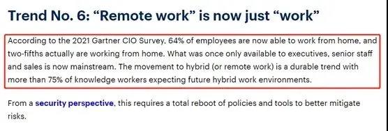 美国知名软件公司HUMU的一位数据工程师Yonatan Zunger曾分析,在未来10~15年,远程办公会渗透到更多的行业中,并开始影响到文化和社会。到2035年,当“千禧一代”开始大规模接管办公室的权力后,远程办公将变得不可避免。在Gartner发布的《2022年网络安全的八大趋势》中说道:向混合(或远程办公)的转变是一个持久的趋势,超过75%的知识工作者期待未来的混合办公环境。
