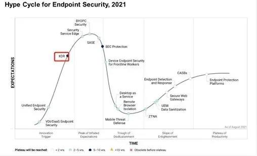 为了应对高级攻击,在威胁搜寻时,关联来自端点和其他地方的数据变得至关重要,因此, Gartner2021年首次将XDR列入半岛在线技术成熟度曲线也是理所应当。