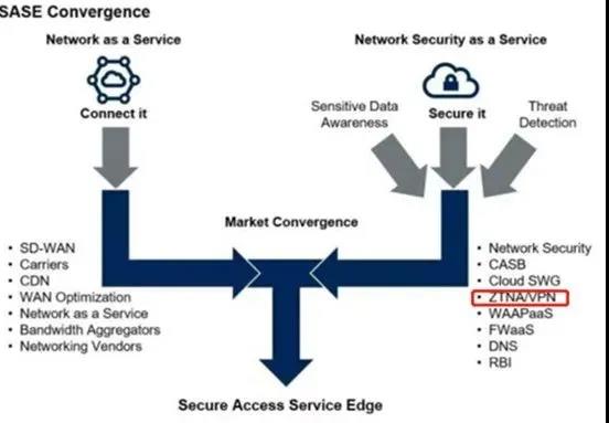 Gartner将ZTNA作为SASE网络安全的核心功能之一,意味着SASE必将践行零信任原则更好的保护基于云的服务,保障企业网络边缘安全接入。