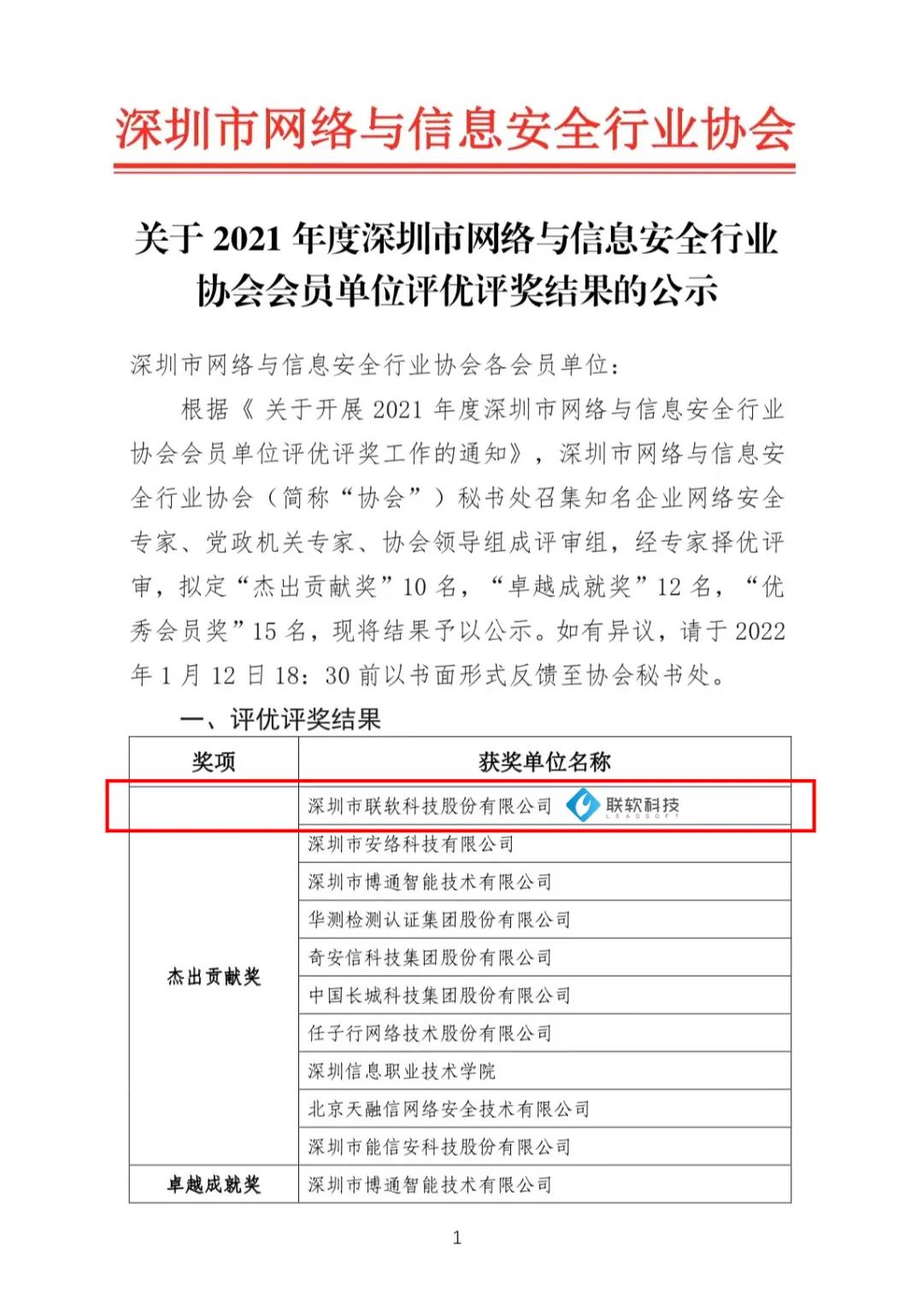 近日,深圳市网络与信息安全行业协会(以下简称协会)为激励会员单位争创一流,更好地推动网络安全行业的发展,开展了协会会员单位2021年度评优评奖工作。经过专家择优评审后,联软科技获“杰出贡献
