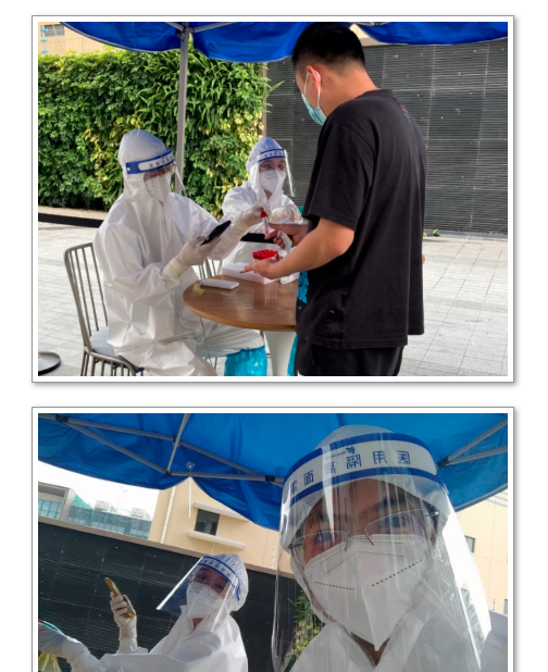 在收到公司的通知后,胡同学主动请缨,赶赴龙岗布吉街道志愿服务工作,负责搜集检测人员信息录入。在太阳底下穿上防护服的胡同学表示,2个小时不能喝水也不能去卫生间,“深圳最近升温了,穿上防护服确实太热了,但是疫情的关键时刻,我想多为社会贡献一份绵薄之力”。