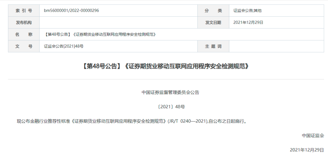 近日,证监会发布《证券期货业移动互联网应用程序安全检测规范》金融行业标准。证监会表示,标准的制定实施,将统一行业对移动互联网应用程序的安全要求,提高移动互联网应用程序的安全性,增强行业机构移动业务信息安全能力,有效防范相关安全风险。