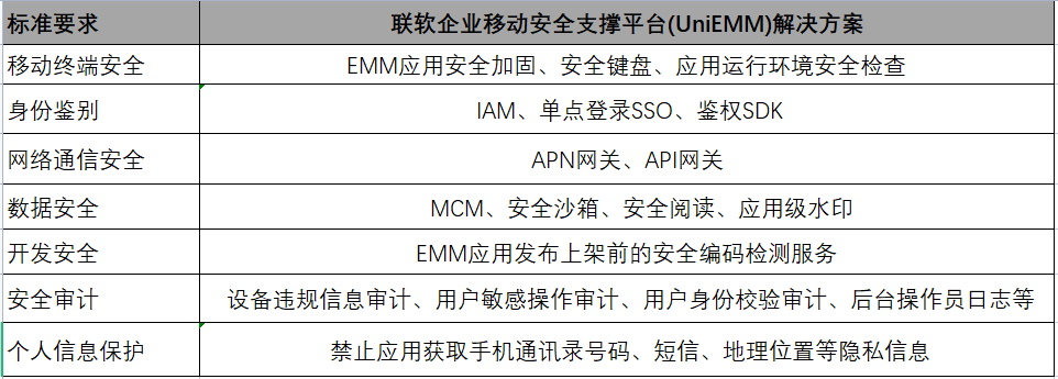 1. 身份认证安全:联软UniEMM可以提供身份安全统一认证体系,包括多因素认证,安全密码键盘、单点登录等安全机制,完全满足规范内关于身份认证安全的全部基本及增强性要求;