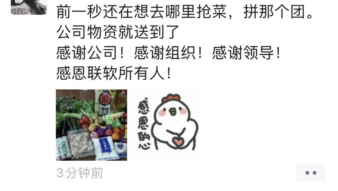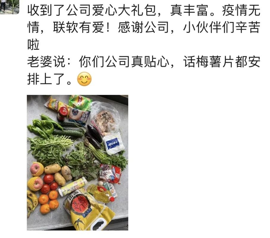 在沪员工怎么样了?公司一直牵挂着!了解到部分员工面临物资紧缺的问题,联软上海分部迅速行动,紧急通过各种渠道联系了物资和运力,在过去一周竭尽所能,全力为在沪小伙伴们送去一份“安心”,给身陷疫情中的驻沪员工送去温暖。