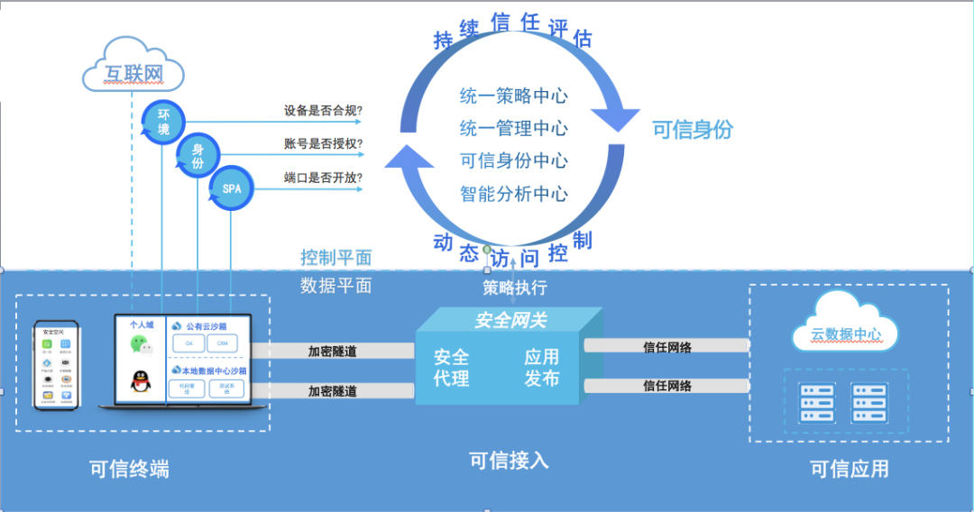 控制平面与数据平面分离零信任部署架构,天然支持多云多数据中心环境,用户通过一个客户端即可实现不同数据中心的统一安全访问,集中可视化统一管理,减轻运维压力,降低实施成本,全局情况轻松掌握。