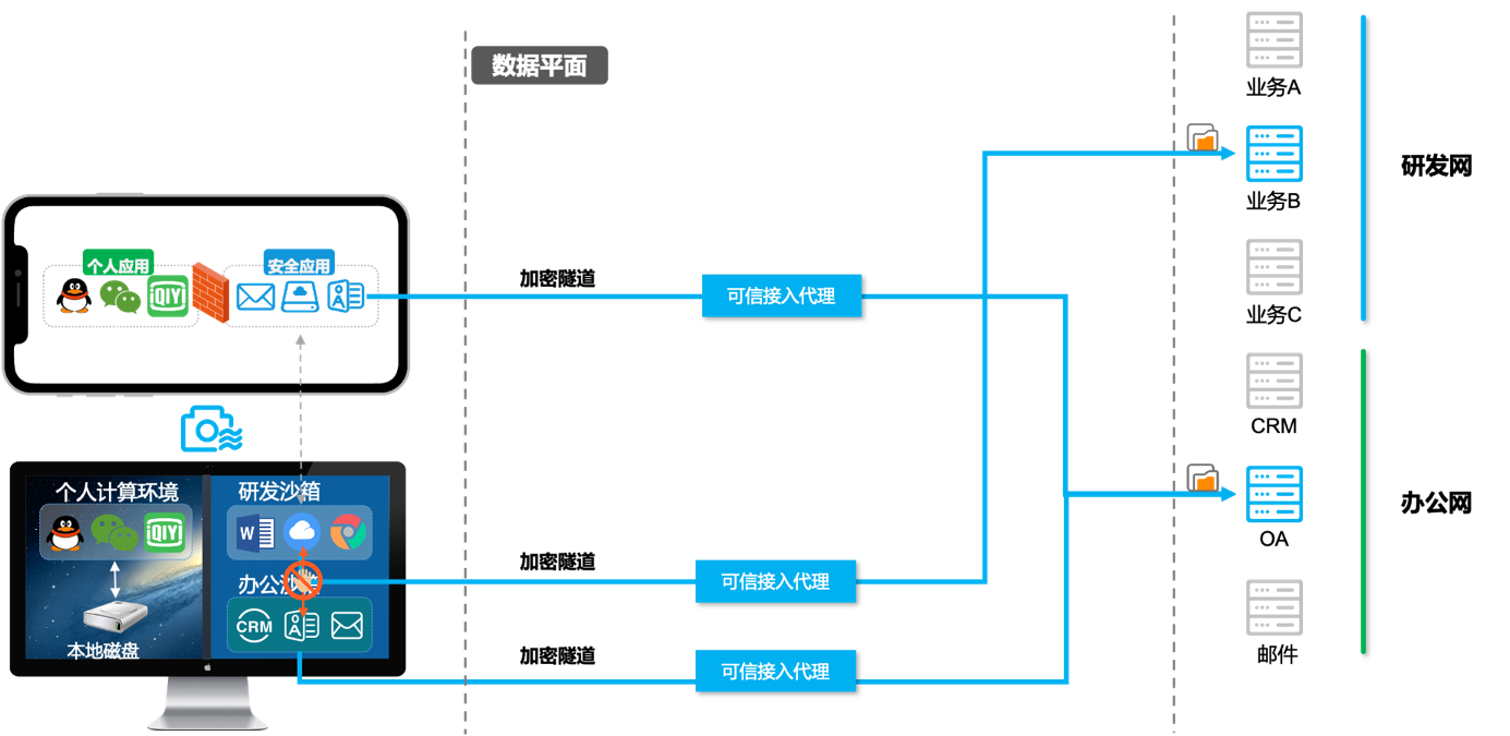 联软科技提供以UniSDP零信任访问控制系统为基础的终端数据保护解决方案,在员工及开发者日常工作的电脑终端上安装UniSDP客户端软件,创建安全可控的沙箱空间,对沙箱内的数据和网络进行隔离。在沙箱内,只允许访问被授权的办公应用及业务系统,同时可以以个人习惯的方式添加并运行相关开发工具及办公软件,在沙箱内的应用和工具产生的所有数据均在沙箱内安全存储,并且通过灵活的数据管控策略实现沙箱内数据的流转控制和审计,结合数字水印及截屏控制,实现全面的数据安全防护。