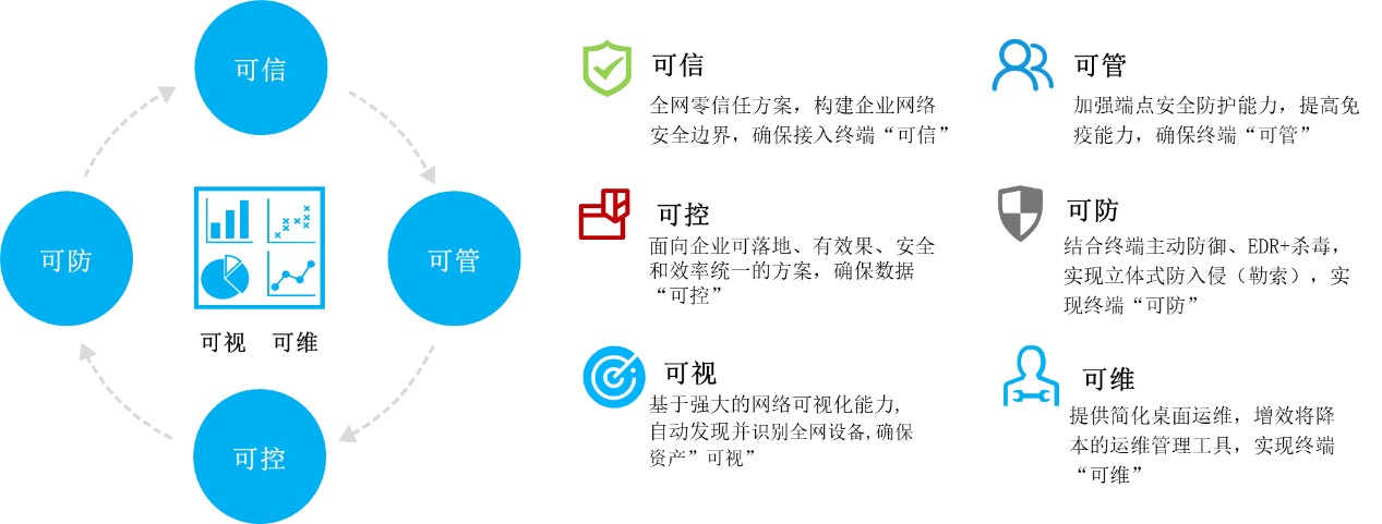 终端桌面管控:涵盖终端安全基线完善与加固、终端标准化管理、运维简化管理、软件正版化和标准化管理;