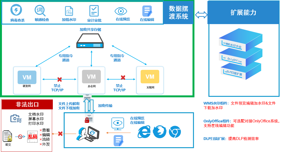 ● 安全交换:通过B/S、C/S客户端及移动端H5统一通过UniNXG安全通道交换文件。实现文件在跨网交换过程中,对文件进行病毒查杀、操作审计、敏感检查、审批管理、文档追踪标记及安全水印,实现文件安全防护及文件泄密追溯。