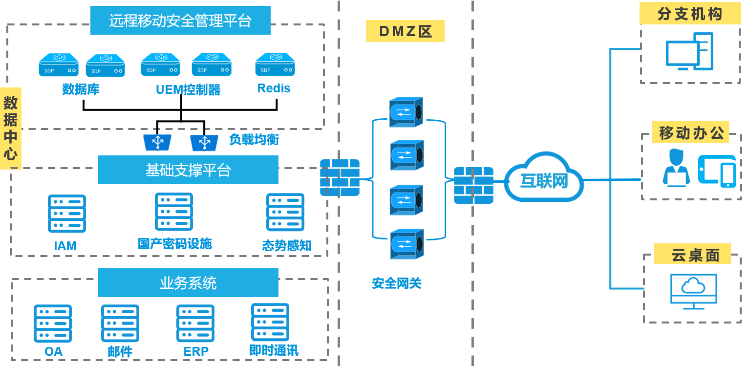 本方案以联软UniSDP零信任访问控制系统与UniEMM企业移动安全管理平台协同应用作为远程移动办公安全管理系统,境内数据中心内部署管理平台与安全网关,作为远程访问设备的统一管理平台,提供远程设备、业务应用与数据安全防护相关功能。通过覆盖PC与移动端的零信任安全防护体系,构建远程办公场景下使用数据过程中的设备、身份、数据、通信管理能力,整体平台部署具体如下: